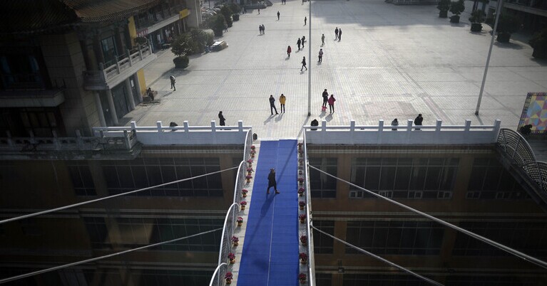 2014年12月29日,重庆解放碑附近一新建楼盘,为了出入方便,在22层高楼的外墙上,分别搭建了两个钢结构的人行天桥。天桥距离地面68米。目前这两座人行天桥方便地连接了解放碑魁星广场和滨江路,市民只要几分钟就能从解放碑直达嘉陵江滨江路。