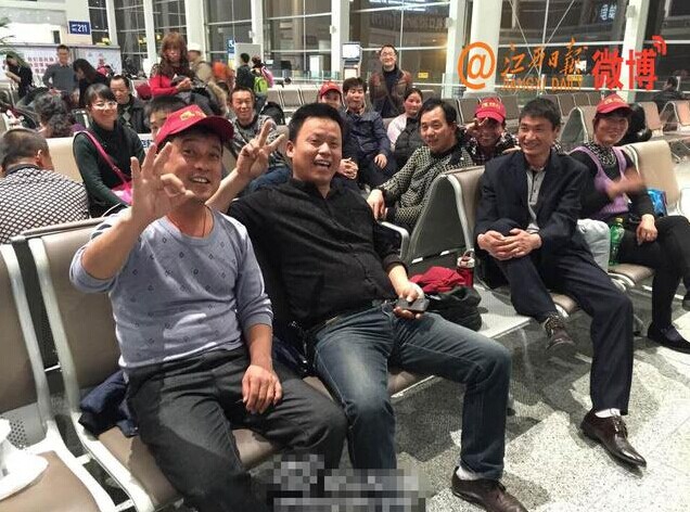 江西安义县80多位农民坐飞机去海南领年终奖,图为他们在候机大厅。