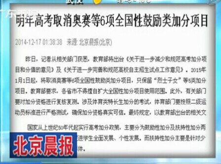 昨日,记者从相关部门获悉,教育部将出台《关于进一步减少和规范高考(课程)加分项目和分值的意见》及《关于进一步完善和规范高校自主招生试点工作意见》。2015年1月1日起,将取消奥赛等6项全国性鼓励类加分项目,只保留“烈士子女”等5类加分项目。教育部要求,各省市不得擅自扩大全国性加分项目使用范围。此外,有关部门要对加分资格进行复核复测。涉及体育类特长生加分的考试,体育部门要按照二级运动员标准进行严格测试,确保加分资格真实可信。最终规定,以教育部出台的相关文件为准。