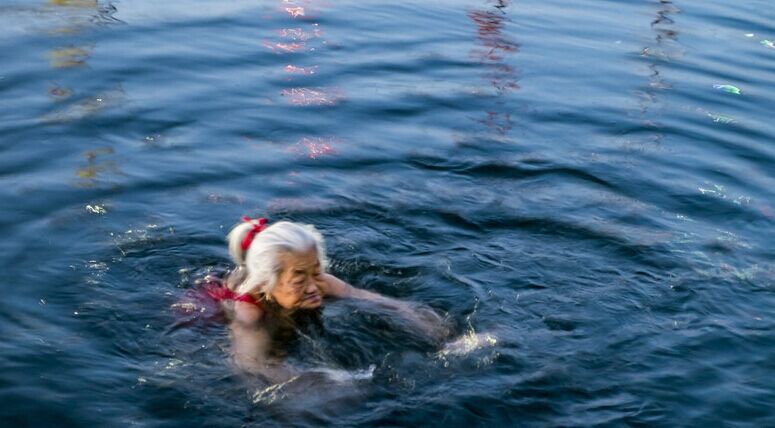 2015年1月27日,北京,什刹海前海冬泳区,几位老人轮番在零下7度的气温下,跃入冰冷的湖水中畅游,使得围观的中外年轻人羡慕不已。前海是北京冬泳爱好者的聚集地,水面早已结上厚厚的冰层,只有一块被凿开的水面。虽然目前是北京最冷的季节,但仍未阻挡这些冬泳老人们的勇气。他们年龄从五十到八十岁之间,男女都有。由于常年坚持冬泳,已经形成固定的生物钟,每天大约有好几拨人。各自一圈,十余成群,相互鼓劲,彼此叫劲。有的还在游完后高声唱歌,引得中外游客纷纷驻足观看、拍照。